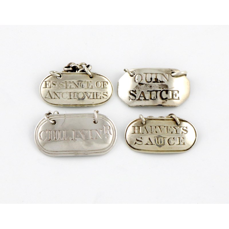 comprising: one by John Wakefield, titled 'ESSENCE OF ANCHOVIES', one 'QUIN SAUCE', one 'HARVEYS SAUCE' and one 'CHILI VINR', approx. weight 0.3oz. (4)