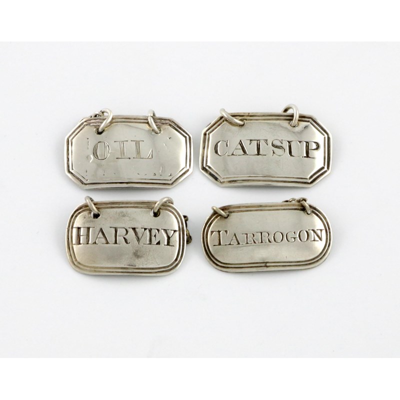 comprising: one by Rawlings and Summers, London 1839, incised 'CATSUP', one 'TARROGON', one 'OIL' and one 'HARVEY', approx. weight 0.3oz. (4)