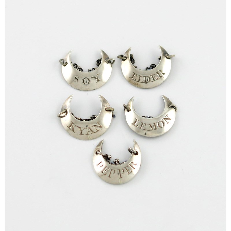 crescent form, incised 'LEMON', 'SOY', 'KYAN', 'ELDER' and 'PEPPER', approx. weight 0.4oz. (5)