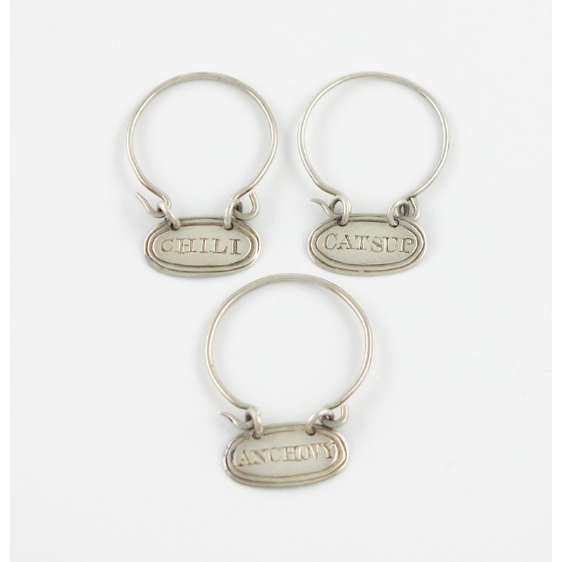 A set of three George III silver neck ring sauce labels