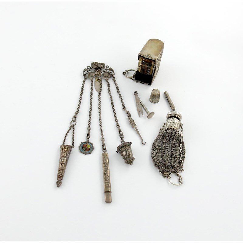 comprising: a miniature common prayer book cover, Birmingham 1900, a chatelaine with five chains and various implements, a pipe tamper, a small knife and French mesh purse. (5)