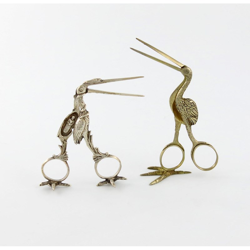 modelled as a stork, ring handles, on a single claw foot, plus a continental silver ribbon threader of similar design, with two claw feet, approx. weight 2.6oz. (2)