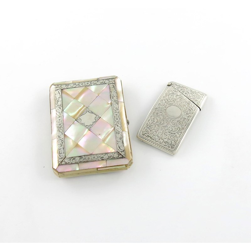 shaped rectangular form, engraved decoration, plus a silver and mother-of-pearl card case of rectangular form, approx. weighable 1.5oz. (2)