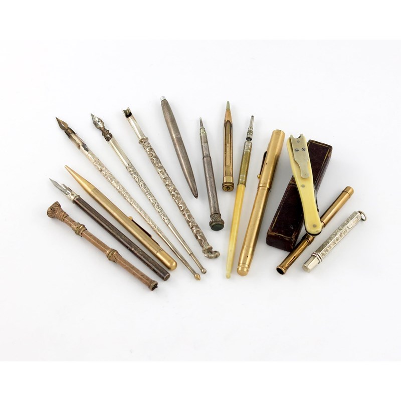 including four silver dip pens, a gilt metal pen and four pencils, plus other items including an ivory handled quill cutter. (14)