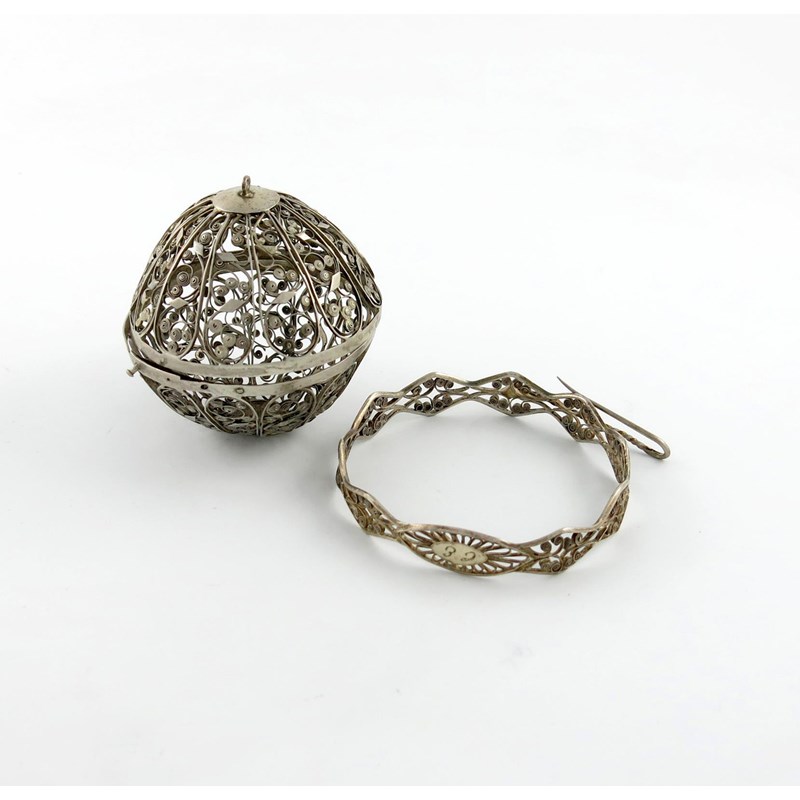 globe form, foliate scroll filigree decoration, the circular support initialled, diameter of ball 7.8cm. (2)