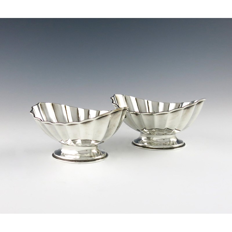 fluted oval form, on a raised circular base, length 14.8cm, approx. weight 12oz. (2)