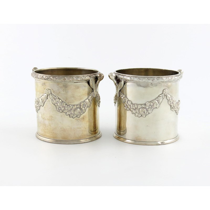 plain cylindrical form, with applied garlands of flowers, foliate handles, height 8.3cm, approx. weight 12.5oz. (2)