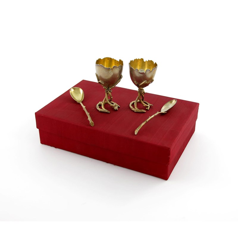 modelled as an egg, foliate branch supports, with two spoons, in a case, height 7.8cm, approx. weight 4.7cm. (4)