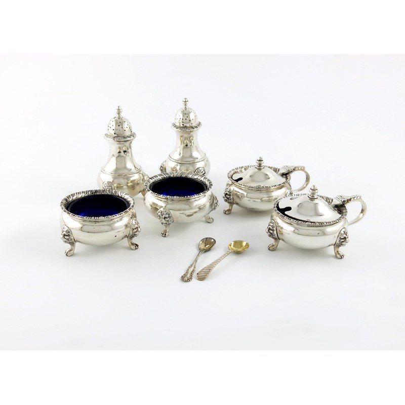 circular form, gadroon borders, on three lion capped paw feet, with blue glass liners and two unassociated salt spoons, approx. weight 22oz. (8)