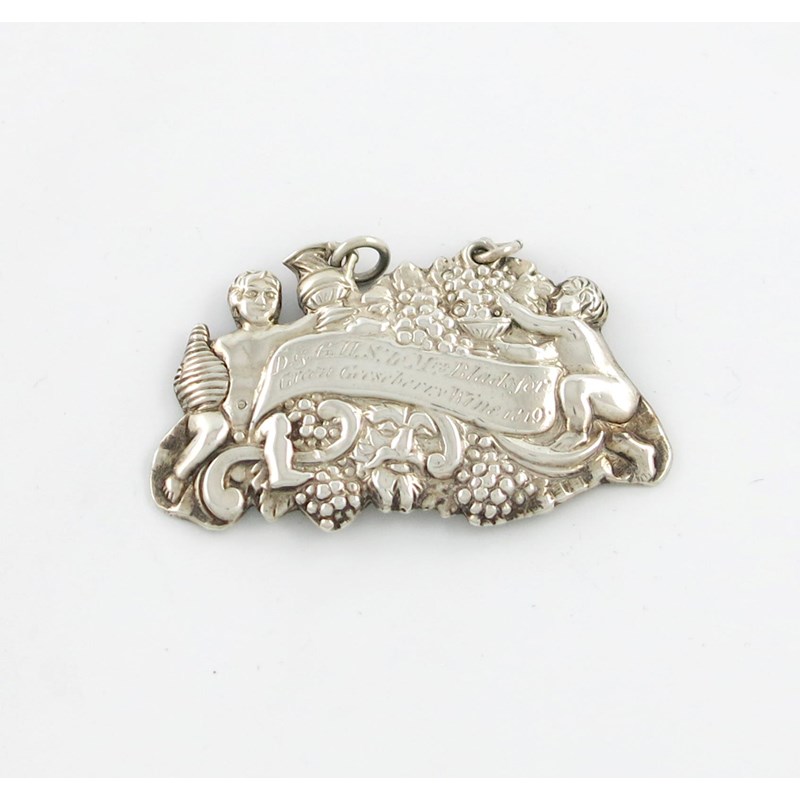 Bacchanalian cherub form, with a goblet and bottle within bunches of grapes, incised 'D and G H.S to Mrs Black for Green Gooseberry wine 1819', length 6cm, approx. weight 0.7oz.