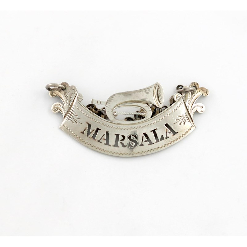 banner form, engraved decoration, foliate mounts, mounted with a bugle pediment, incised 'MARSALA', length 5.4cm, approx. weight 0.2oz.