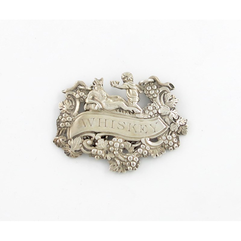 shaped oval form, modelled as Bacchus being passed wine by a putto, with pierced trailing grapevines, incised 'WHISKEY', length 6cm, approx. weight 0.9oz.