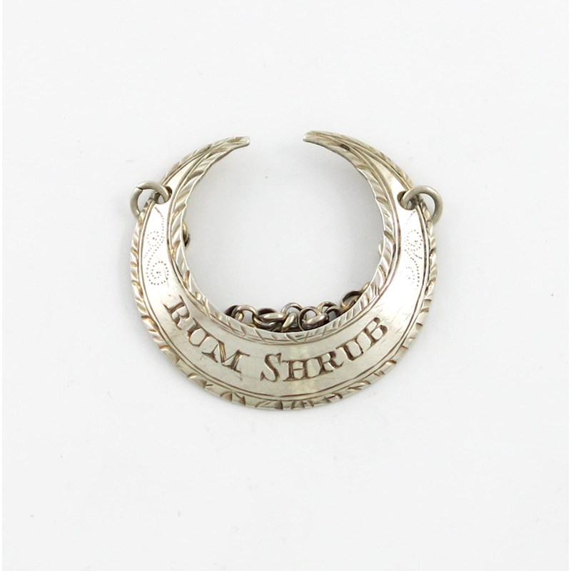 crescent form, feather-edge border, incised 'RUM SHRUB', length 3.7cm, approx. weight 0.2oz.
