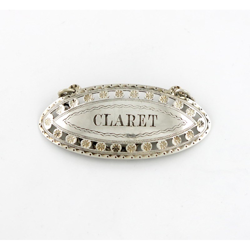 oval form, pierced and engraved decoration, incised 'CLARET', length 6cm, approx. weight 0.3oz.