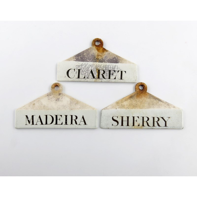 rectangular form, tapering arched tops, titled in black 'MADERIA', 'CLARET' and 'SHERRY', length 14cm. (3)
