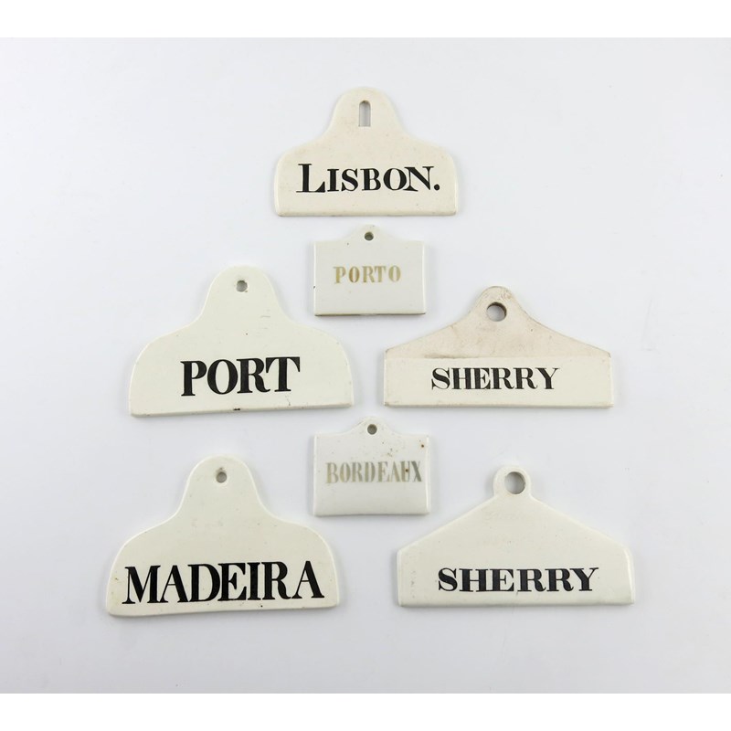 arched rectangular form, titled in black 'LISBON', 'SHERRY', (X2), 'MADEIRA', 'PORT', plus in gold lettering 'PORTO' and 'BORDEAUX'. (7)