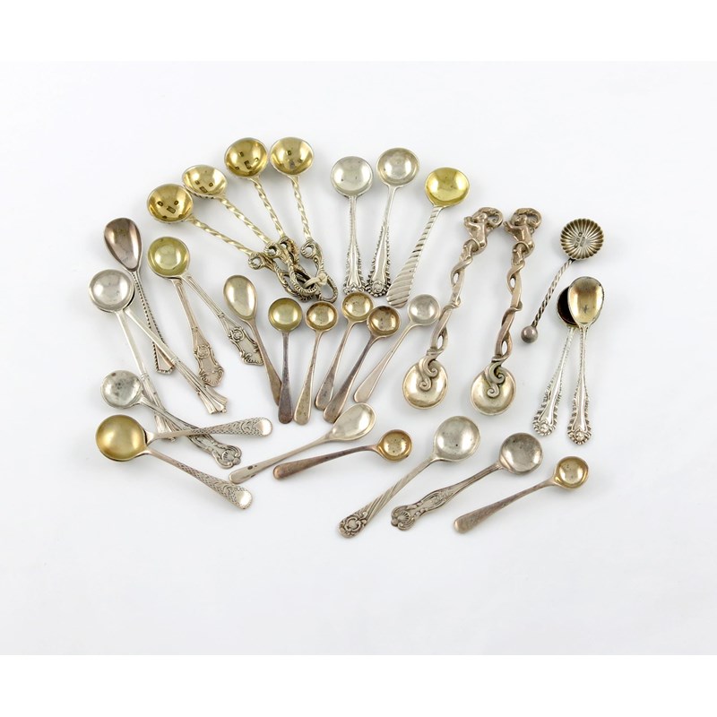 including: a set of four Victorian silver gilt salt spoons, the twist stems with looped whip terminals, shell bowls, by William Dudley, Birmingham 1849, a Scottish figural pair, and twenty-five others, approx. weight 6oz. (qty)