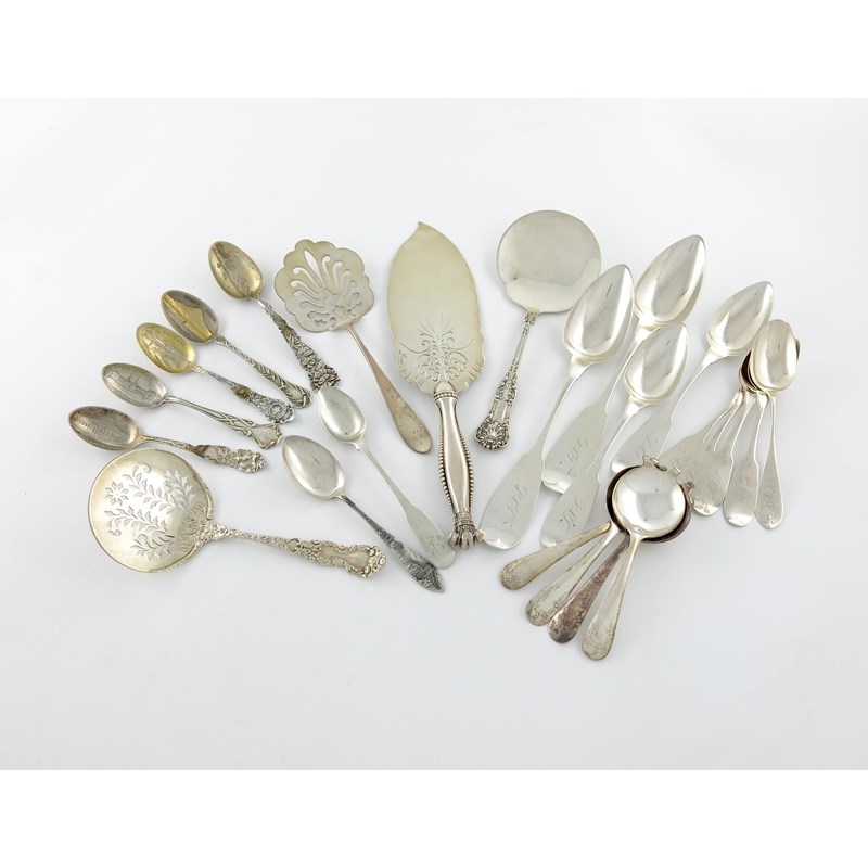 comprising; a serving slice, beaded handle, three slices, two tablespoons, two dessert spoons, thirteen teaspoons, plus five plated spoons, approx. weight 19oz. (qty)