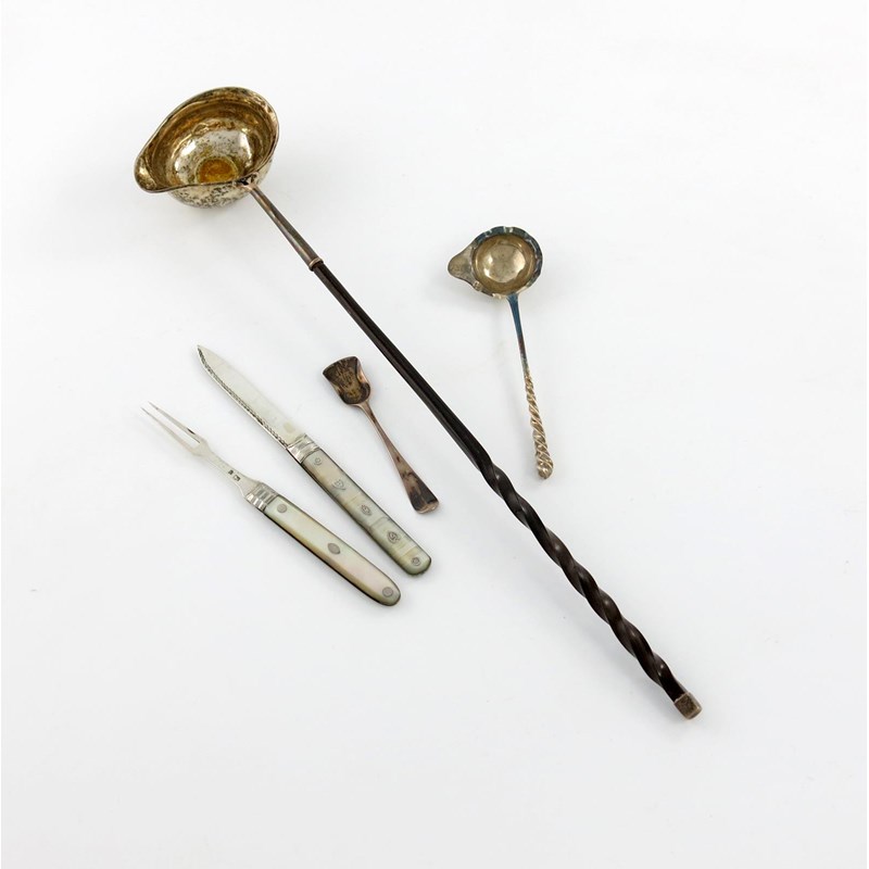 comprising: a toddy ladle, the bowl set with a coin, twisted whale-bone handle, a folding fruit knife and fork, an unmarked cream ladle and a salt spoon. (5)