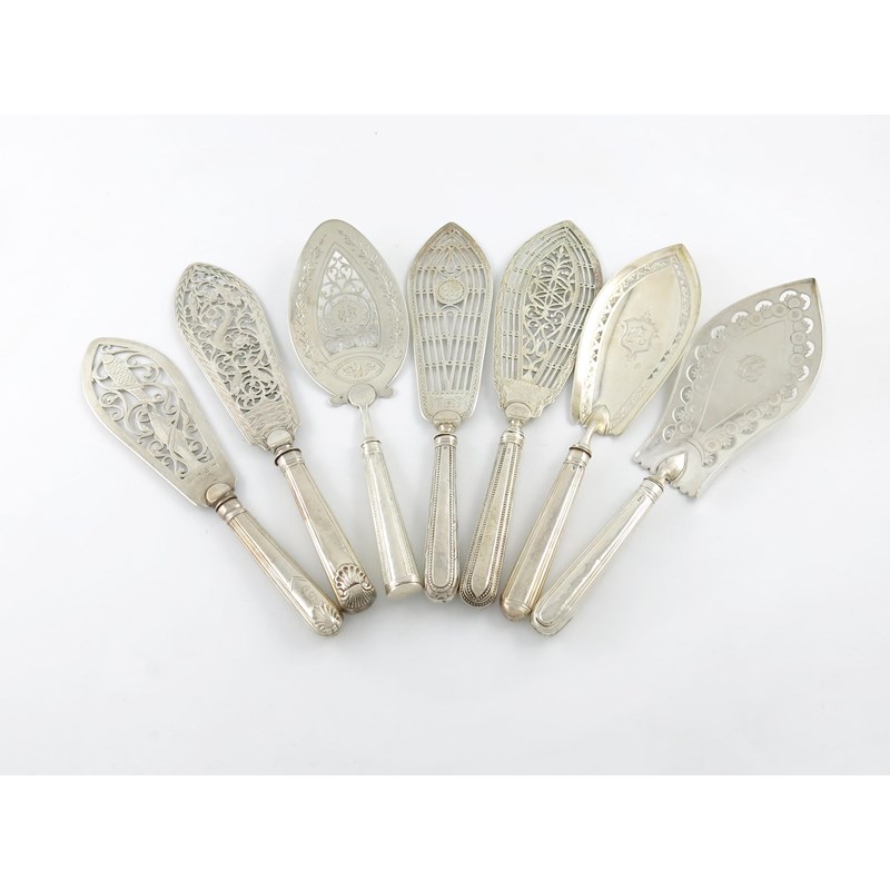 A collection of seven antique silver fish slices