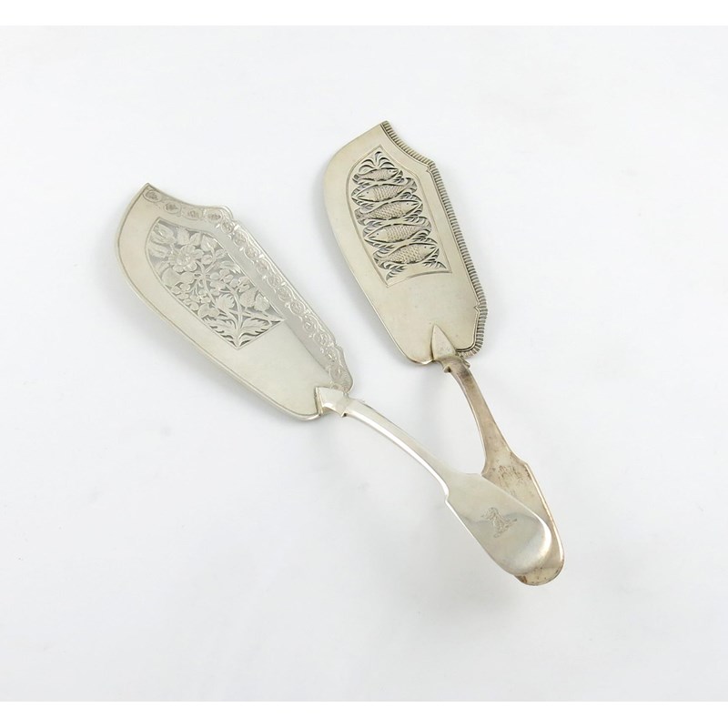 the blade pierced and embossed with five fish, gadroon border, the terminal initialled, plus a George IV silver Fiddle pattern fish slice, London 1823, the blade pierced and engraved with a roses, shamrock, and thistles, approx. weight 9.5oz. (2)