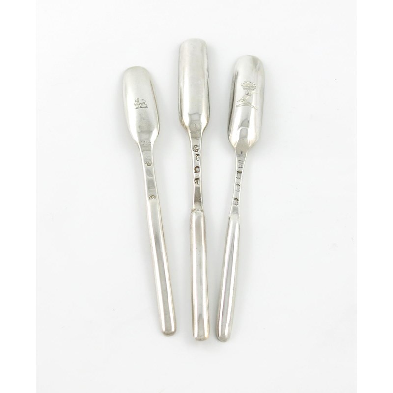 comprising: a Queen Anne example, probably by John Ladyman, London 1703, the reverse of the bowl with a crest, plus one by William Toone, London 1726, and one 1739, the reverse of the bowl with a crest, approx. weight 4.2oz. (3)