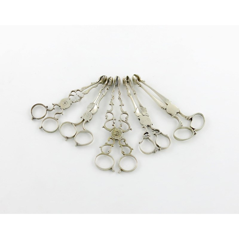 A collection of five pairs of 18th century silver sugar nips