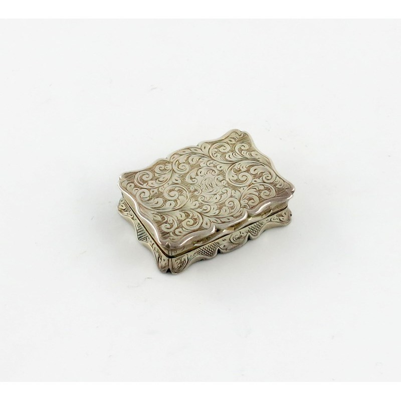 rectangular form, engraved foliate scroll decoration, the hinged cover with a monogram, the interior with a hinged pierced and engraved silver-gilt foliate scroll grille, length 4cm, approx. weight 0.8oz.