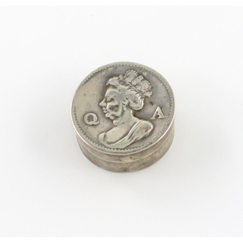 circular form, the pull-off cover with an image of Queen Anne and 'Q' and 'A', diameter 2.2cm, approx. weight 0.1oz.