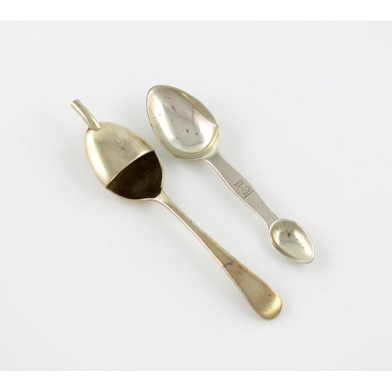 plain double form, with a crest, plus an electroplated medicine spoon, approx. weighable 0.5oz. (2)