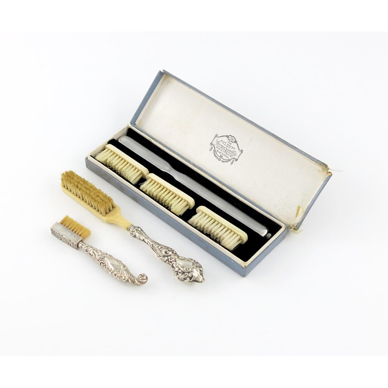 shaped rectangular form, engine-turned decoration, with three detachable ivory heads, in a box, plus two further silver and ivory brushes. (3)