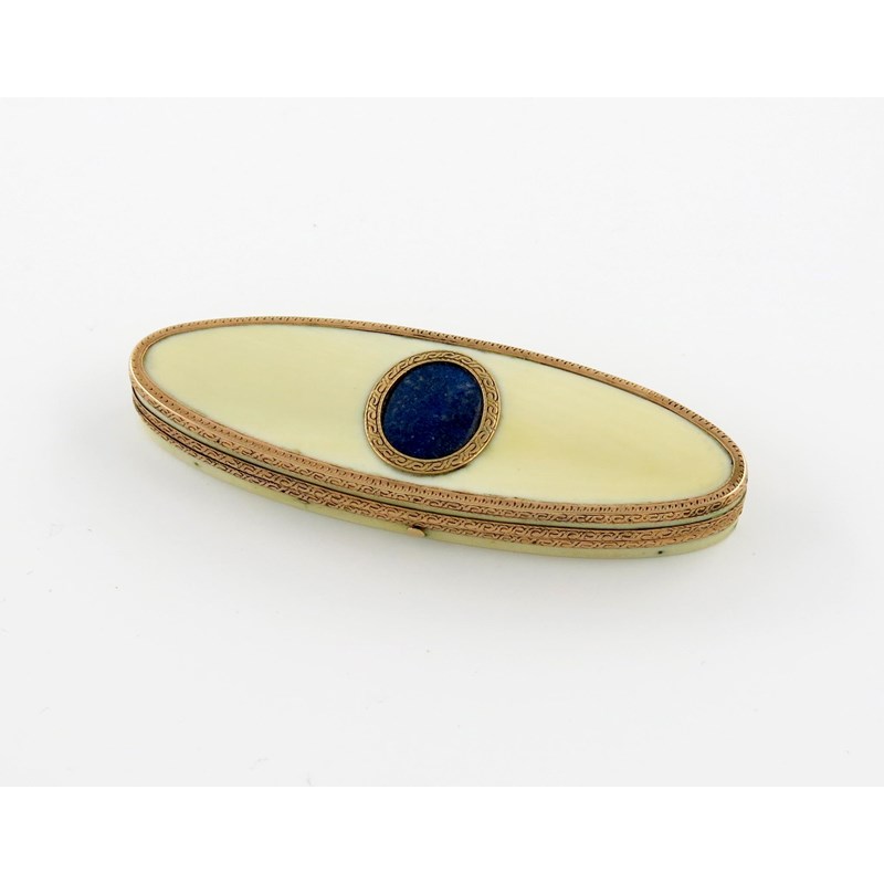 oval form, the hinged cover with an oval blue hard stone cartouche, engraved gold borders, the interior with velvet lining, length 9.3cm.