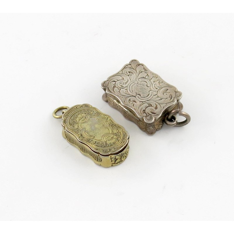 rectangular form, engraved foliate scroll decoration, the hinged cover with initials, the interior with a hinged pierced and engraved silver-gilt grille, length 3cm, plus a small Victorian silver vesta box, Birmingham 1857, oblong form, engraved decoration, approx. weight 0.7oz. (2)