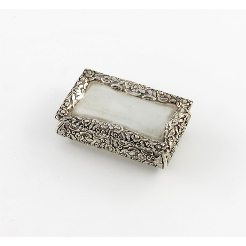 rectangular form, foliate scroll sides and hinged cover, engine-turned base, gilded interior, length 7.5cm, approx. weight 3.5oz.