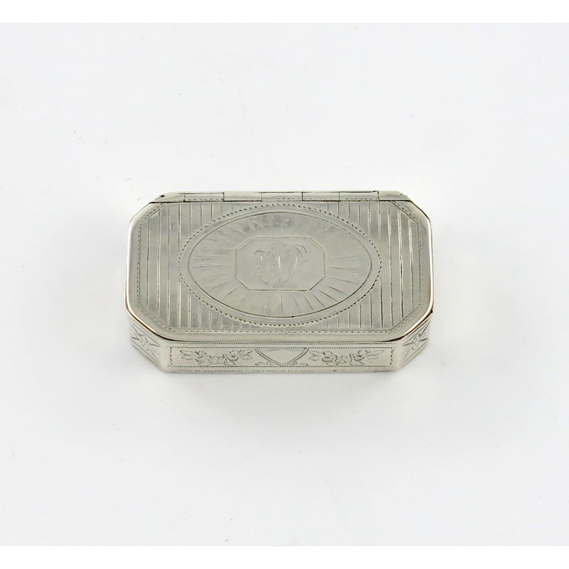 rectangular form, canted corners, engraved decoration, the hinged cover with initials, length 6.5cm, approx. weight 1.4oz.