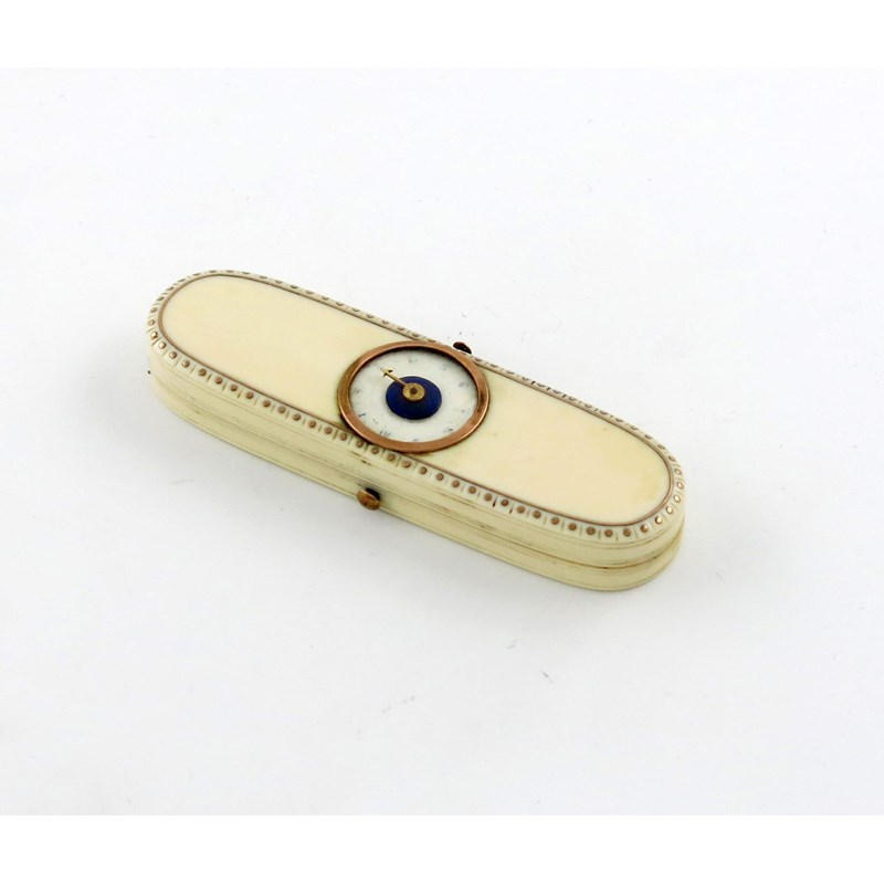 oblong form, the hinged cover with a whisk counter marker under glass, the dial numbered one to ten, with a push-button arrow, gold mounts, the interior with a mirror and velvet lining, length 8.5cm.