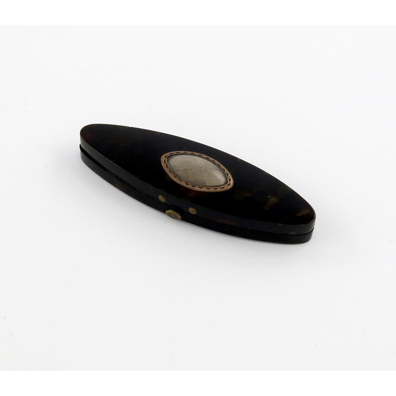oval navette form, the hinged cover with an oval cartouche of plaited hair under glass, the interior with a mirror and velvet lining, length 9cm.