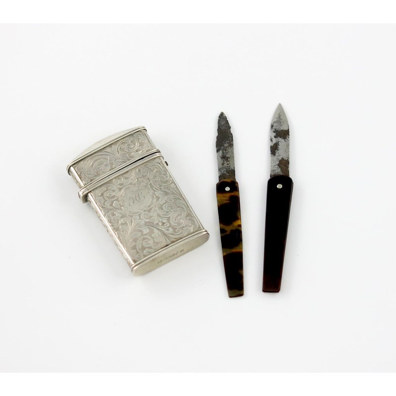 tapering rectangular form, engraved decoration, the interior with two tortoiseshell lancets, length 6.3cm, approx. weight 0.9oz.