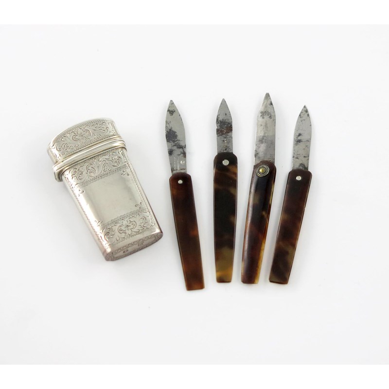 tapering rectangular form, engraved decoration, the interior with four tortoiseshell lancets, length 6.1cm, approx. weight 1.2oz.
