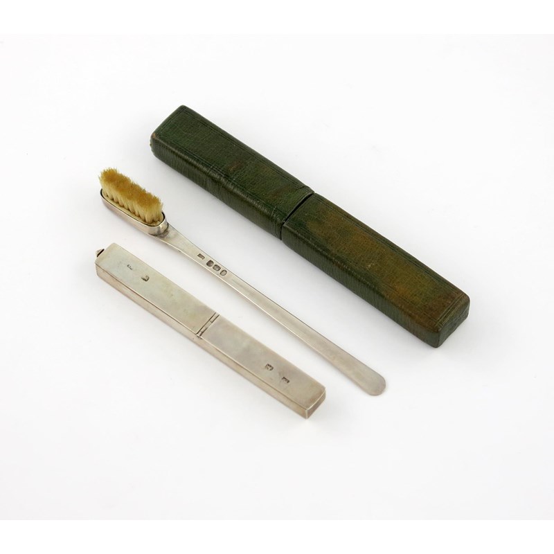 the box of plain rectangular form, with two hinged compartments, the toothbrush of plain form, in a fitted green case, length of box 9.3cm.