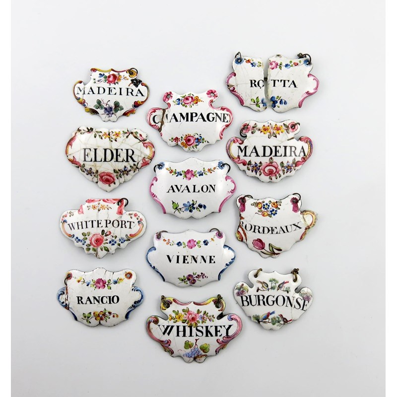 cartouche and escutcheon form, with black lettering on a white ground decorated with flowers, including: 'RANCIO', 'VIENNE', 'ELDER', 'AVALON' and 'ROITTA', and other titles. (12)