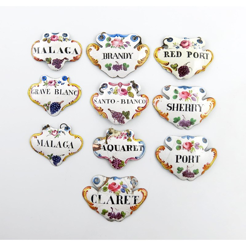 cartouche and escutcheon form, with black lettering on a white ground decorated with flowers, including: 'SANTO-BIANCO', 'MALAGA', 'RED PORT', 'GRAVE BLANC' and other titles. (10)