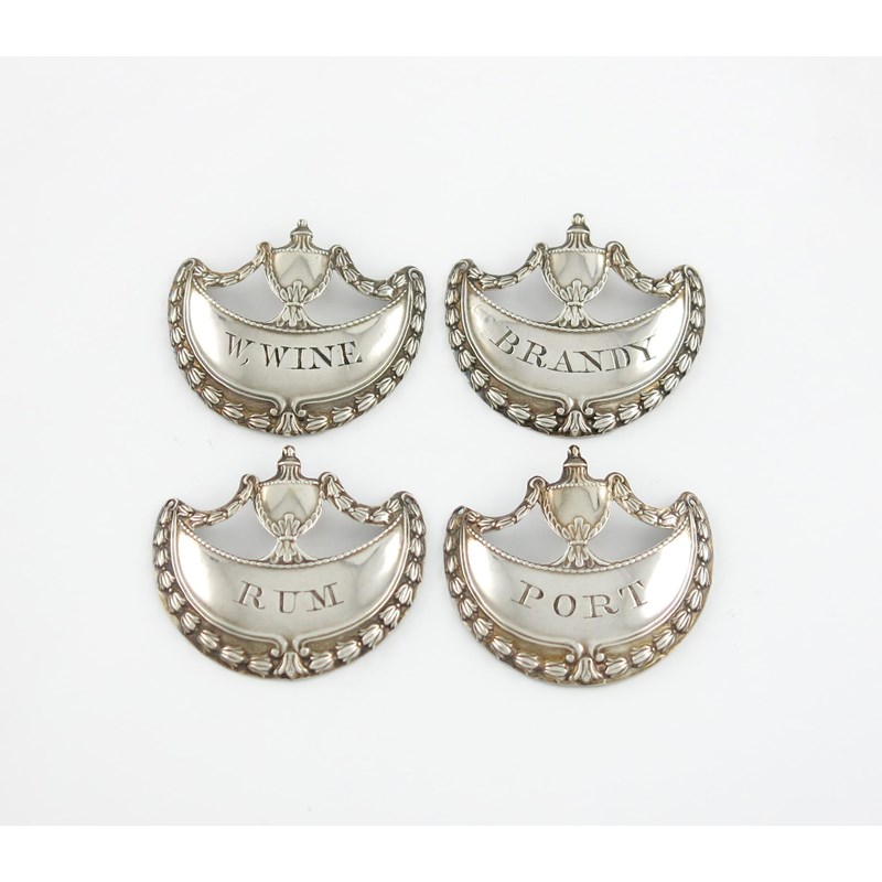 crescent form, mounted with an urn and swags, beaded border, incised 'RUM', 'W.WINE', 'PORT' and 'BRANDY', length 5.3cm, approx. weight 0.9oz. (4)
