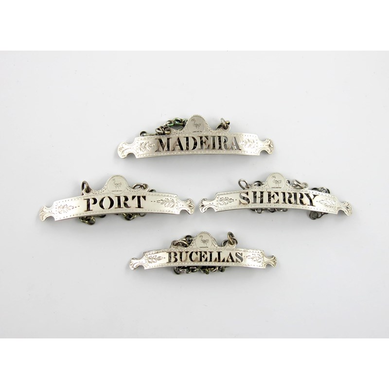 narrow arched rectangular form, shaped ends, crested, incised 'BUCELLAS', 'MADEIRA', 'SHERRY' and 'PORT', length 6.3cm, approx. weight 0.9oz. (4)