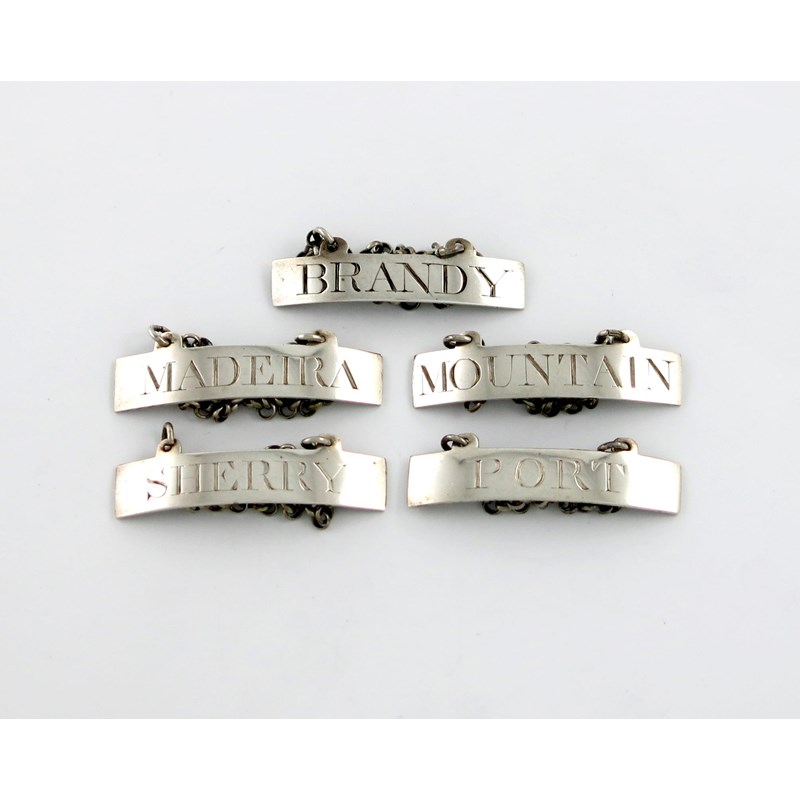 narrow rectangular form, incised 'MOUNTAIN', 'BRANDY', 'MADEIRA', 'SHERRY' and 'PORT', length 4.6cm, approx. weight 1.2oz. (5)