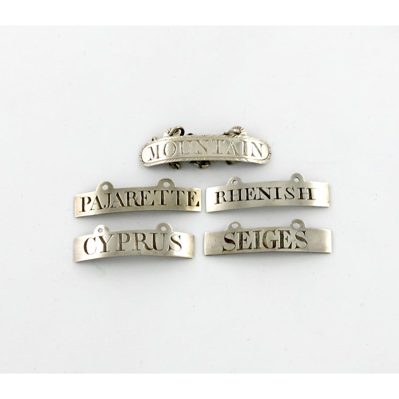 narrow rectangular form, incised 'SEIGES', 'CYPRES', 'PAJARETTE', 'RHENISH' and 'MOUNTAIN', length 4.6cm, approx. weight 1.2oz. (5)