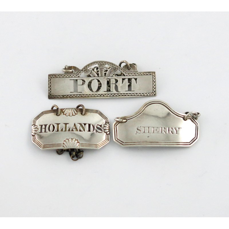comprising: one by William Bateman, London 1821, incised 'SHERRY', one 'HOLLANDS', London 1812, and one pierced 'PORT', approx. weight 0.6oz. (3)