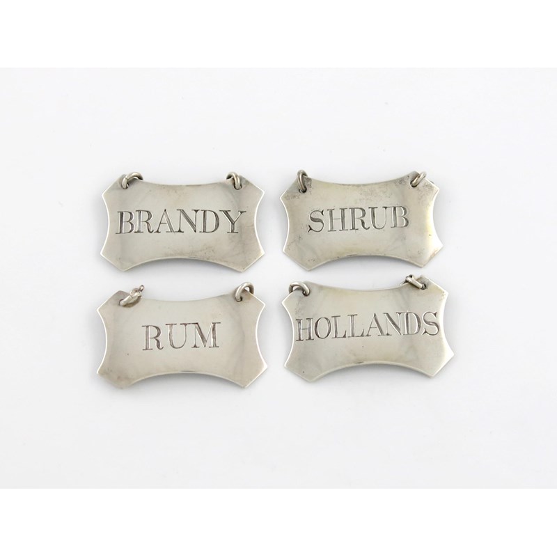 shaped rectangular form, incised 'SHRUB', 'BRANDY', 'HOLLANDS', and 'RUM', length 4.4cm, approx. weight 1.1oz. (4)