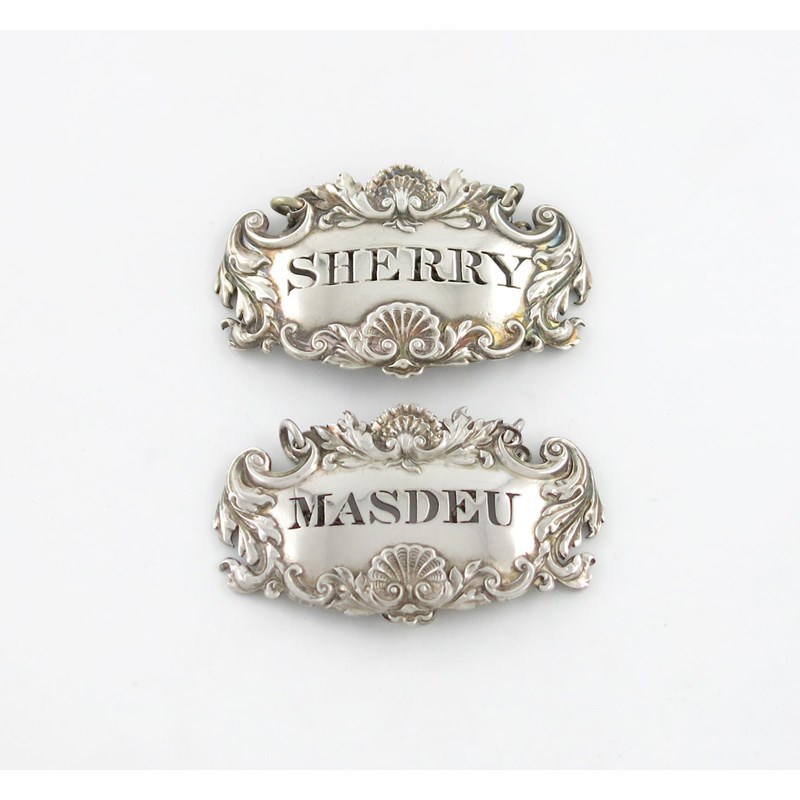 shaped oval form, foliate scroll and shell borders, pierced 'MASDEU', length 6cm, plus a George IV silver wine label, of similar form, London 1822, pierced 'SHERRY', approx. weight 1.1oz. (2)