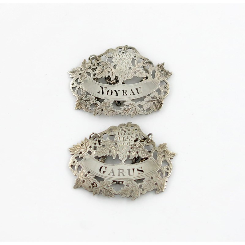 pierced oval form, with bunches of grapes and vine decoration, pierced 'GARUS' and 'NOYEAU', length 5.5cm. (2)